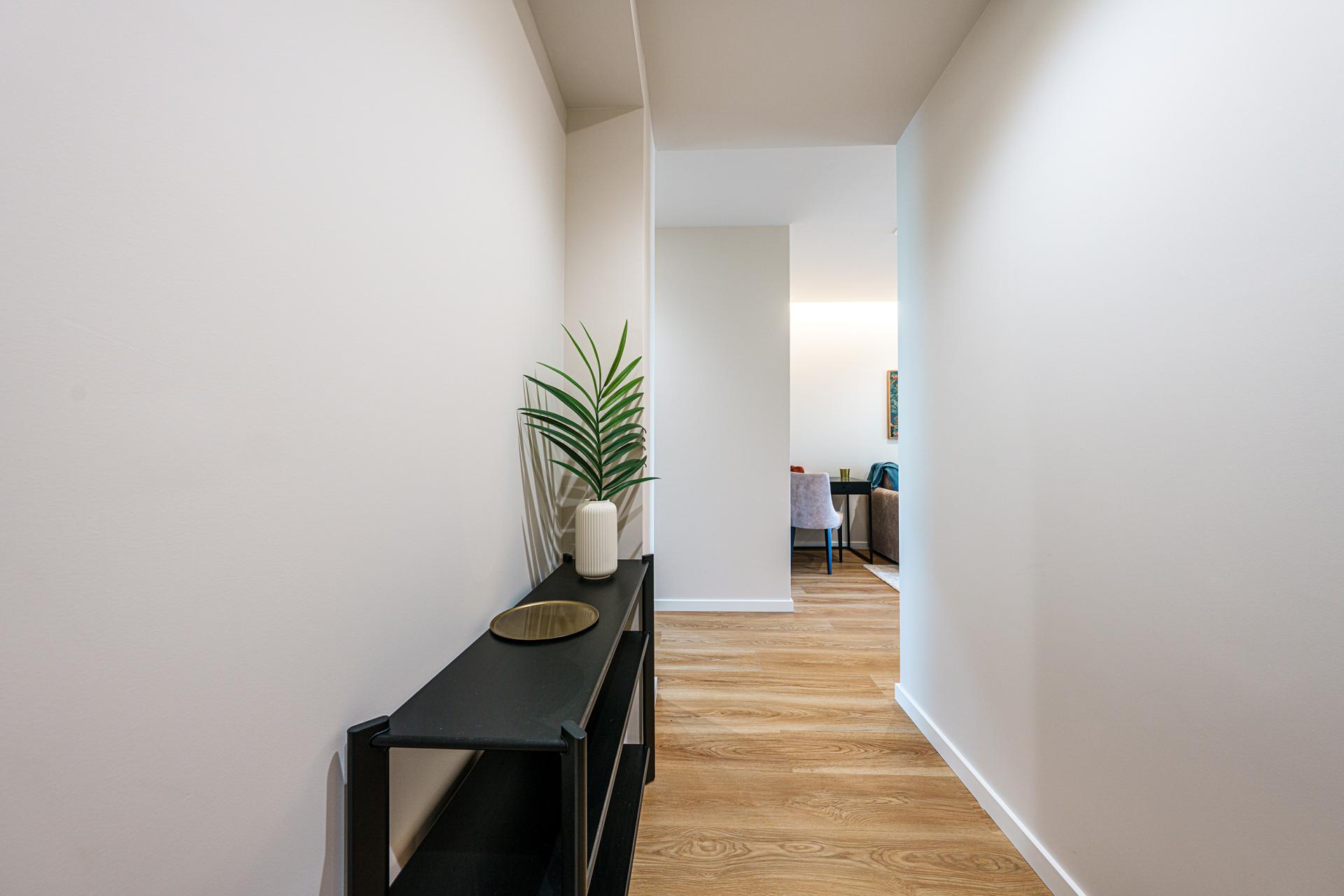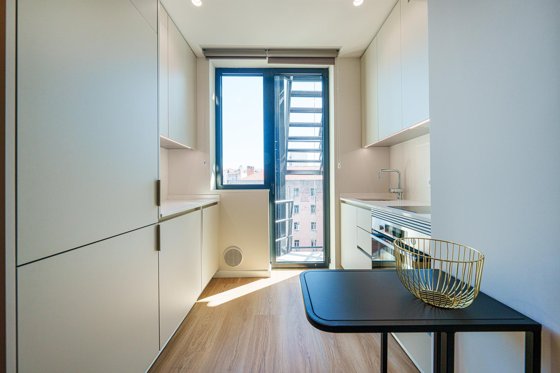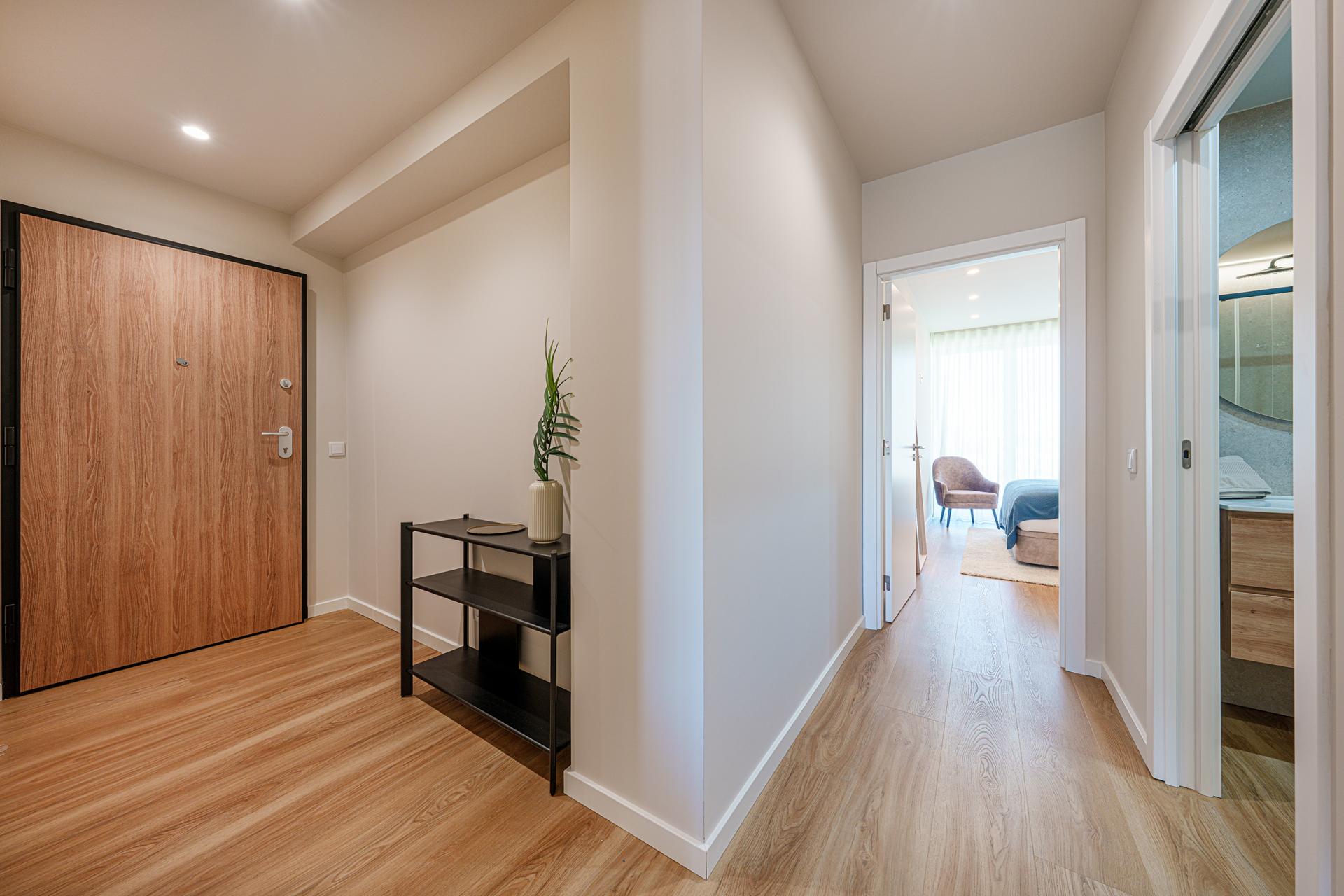 Este apartamento T1, a porta em frente do corredor de circulação do piso, proporciona uma vivência urbana moderna e dinâmica. O projeto conjuga design contemporâneio e soluções funcionais que promovem conforto, fluidez e bem-estar no quotidiano.