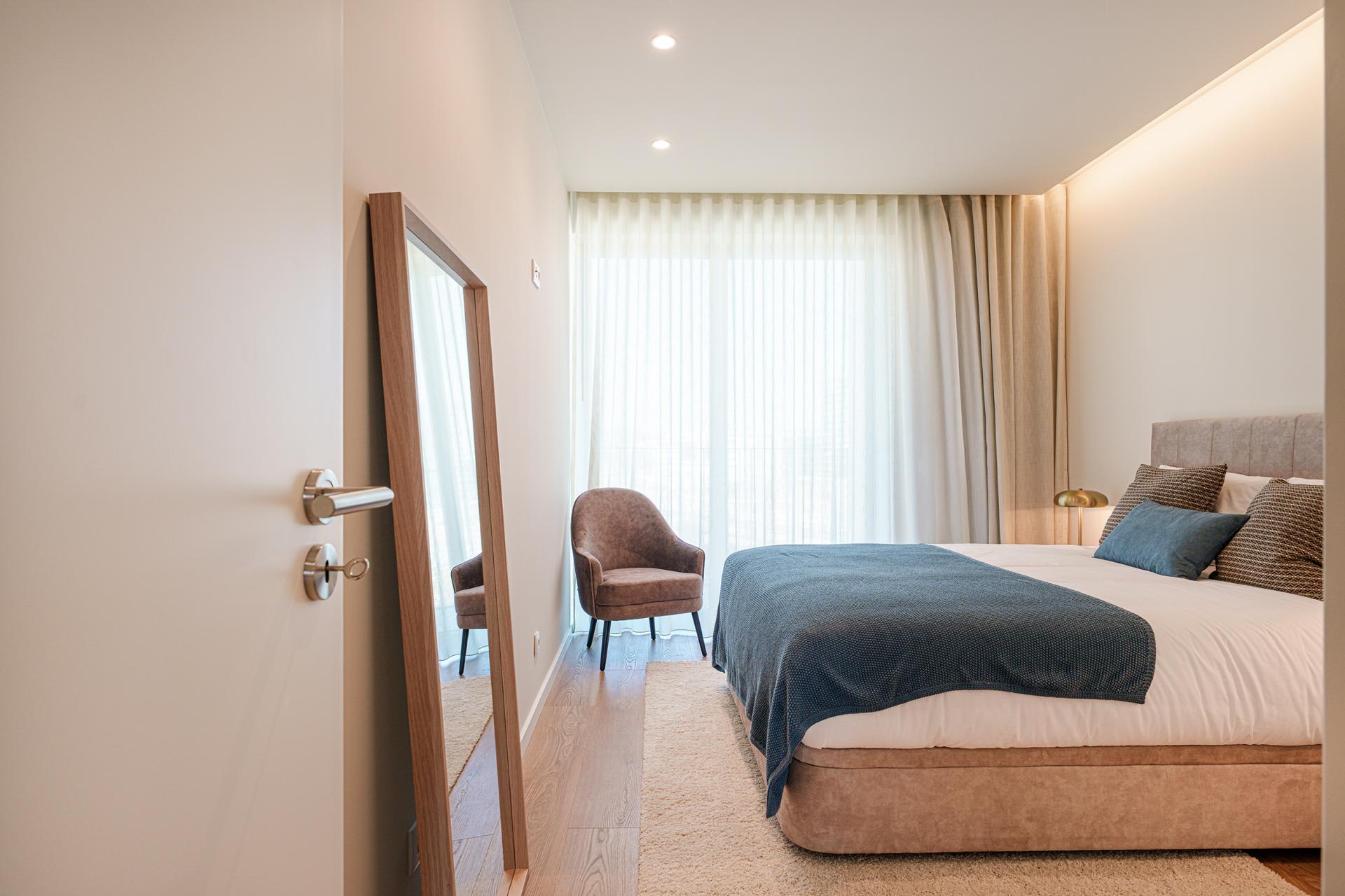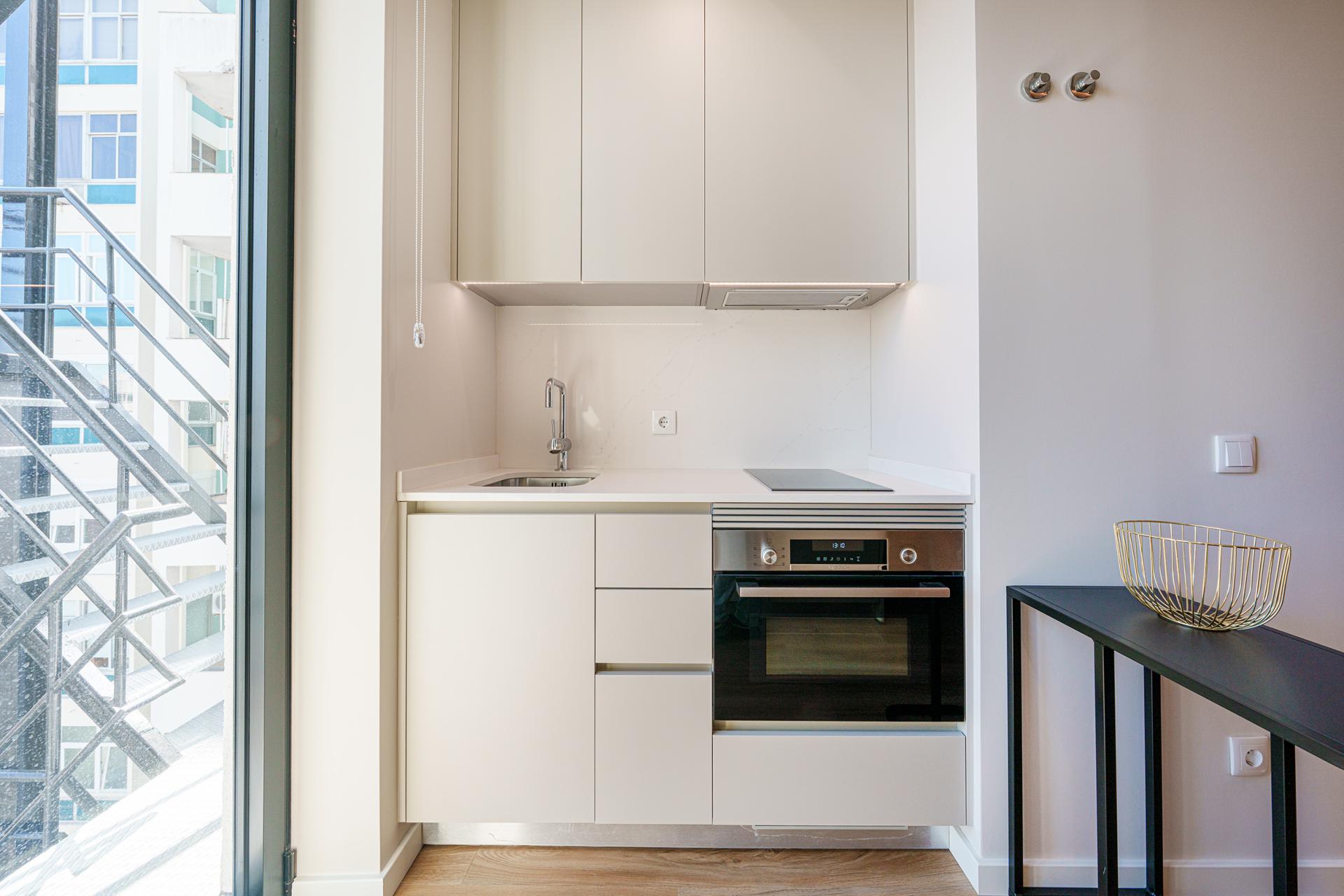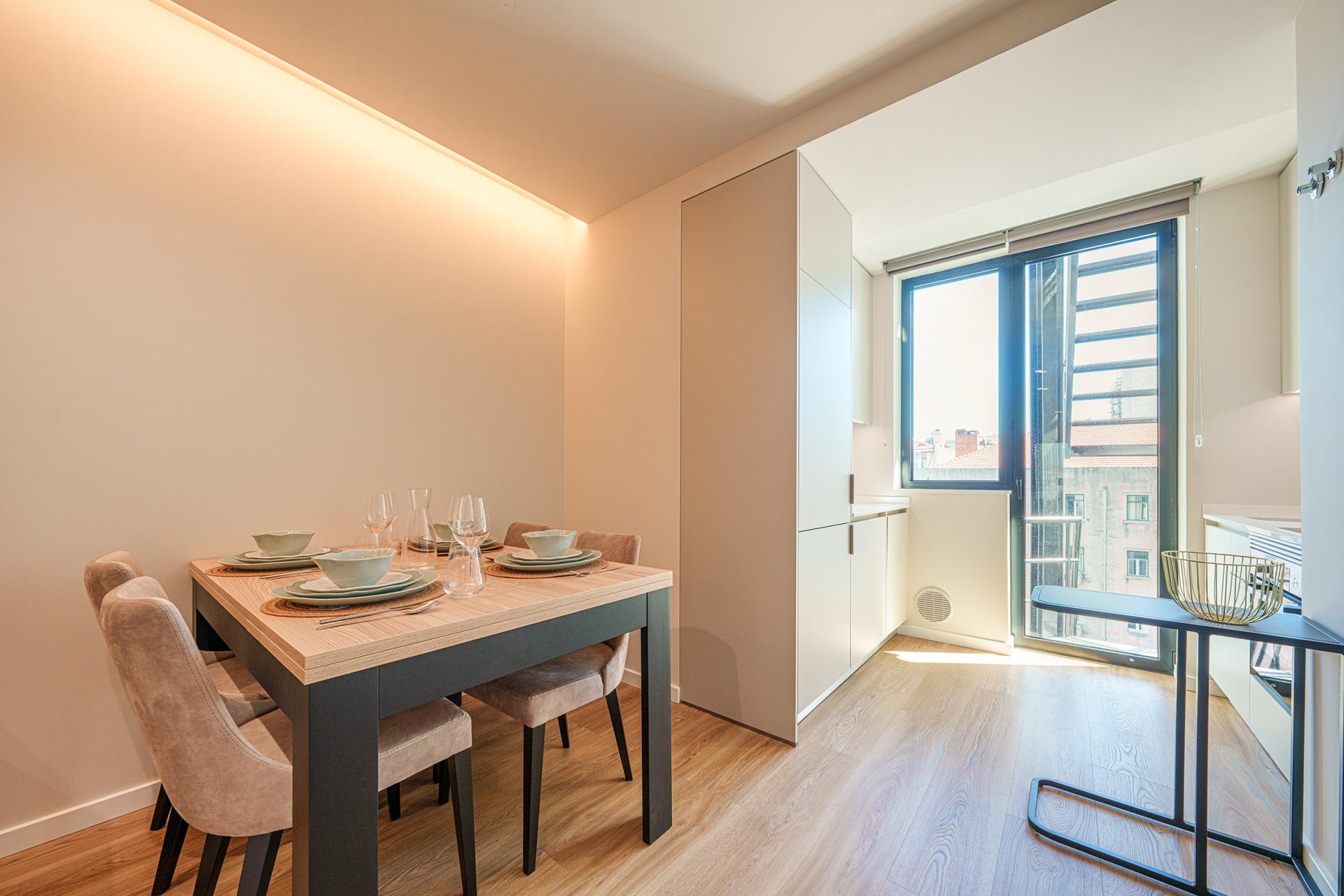 Este apartamento T1, a porta em frente do corredor de circulação do piso, proporciona uma vivência urbana moderna e dinâmica. O projeto conjuga design contemporâneio e soluções funcionais que promovem conforto, fluidez e bem-estar no quotidiano.