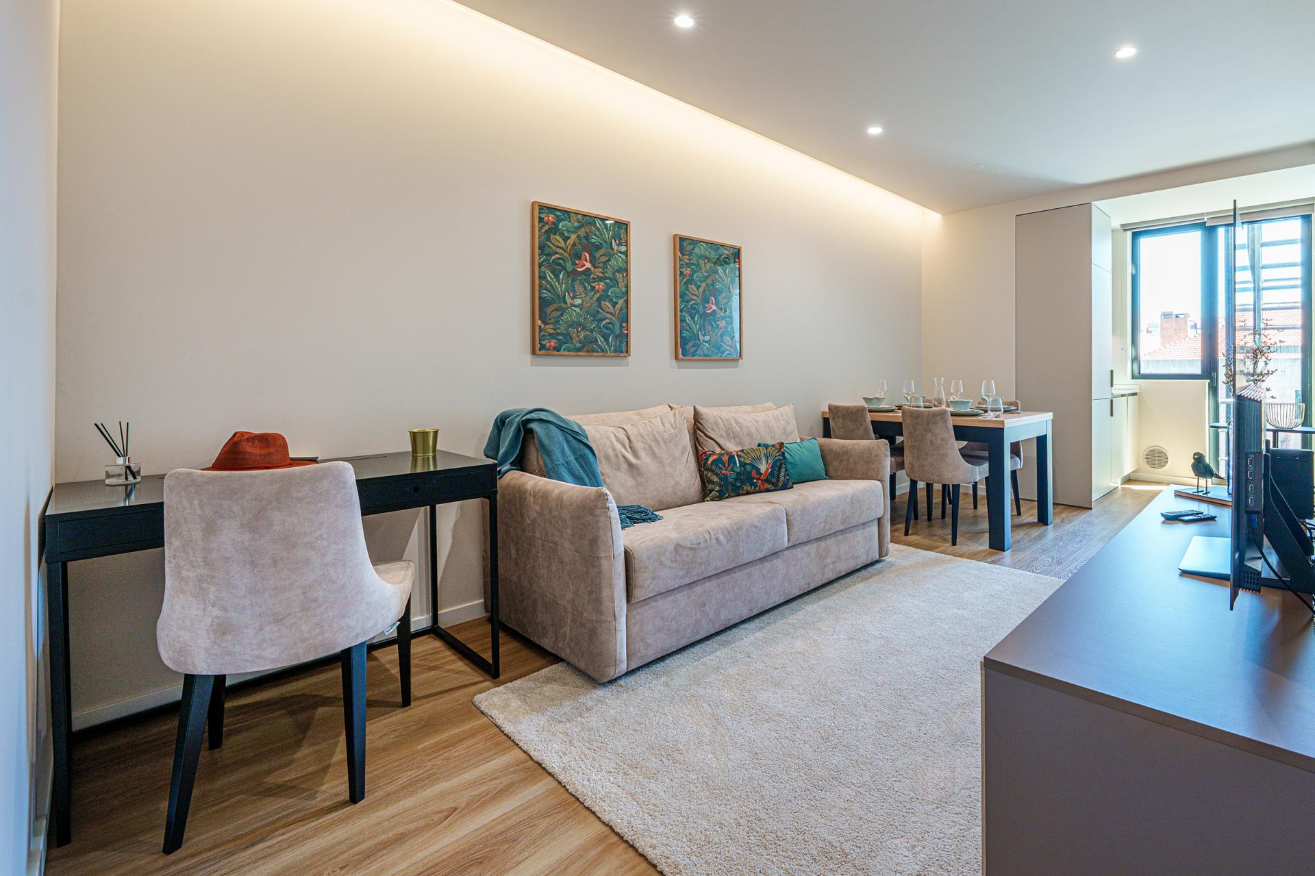 A zona social integra sala e cozinha totalmente equipada, criando um ambiente amplo e convidativo. O quarto, bem dimensionado e acolhedor, oferece a tranquilidade necessária para o descanso, equilibrando a energia do centro da cidade com o conforto interior.
