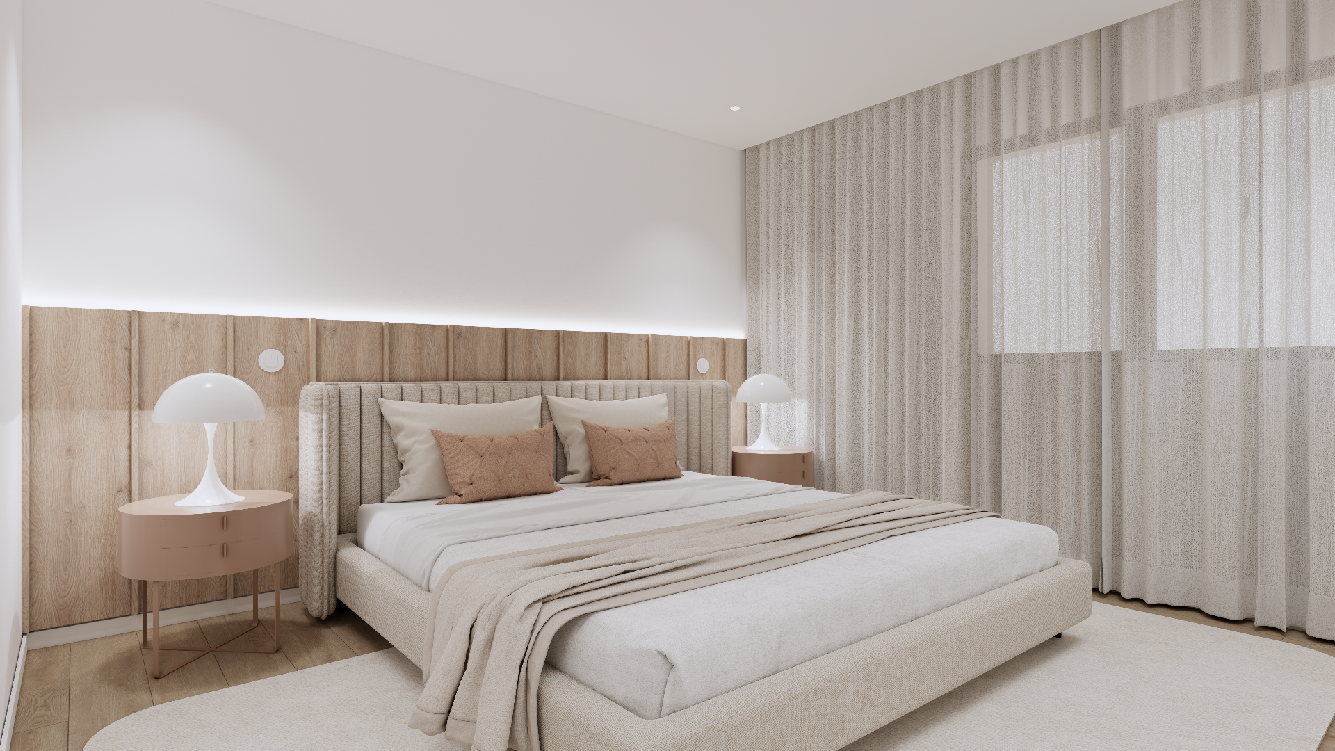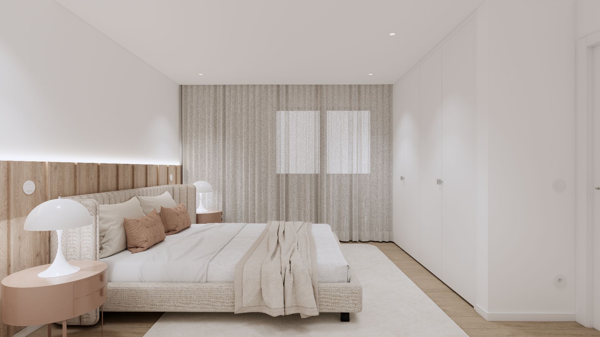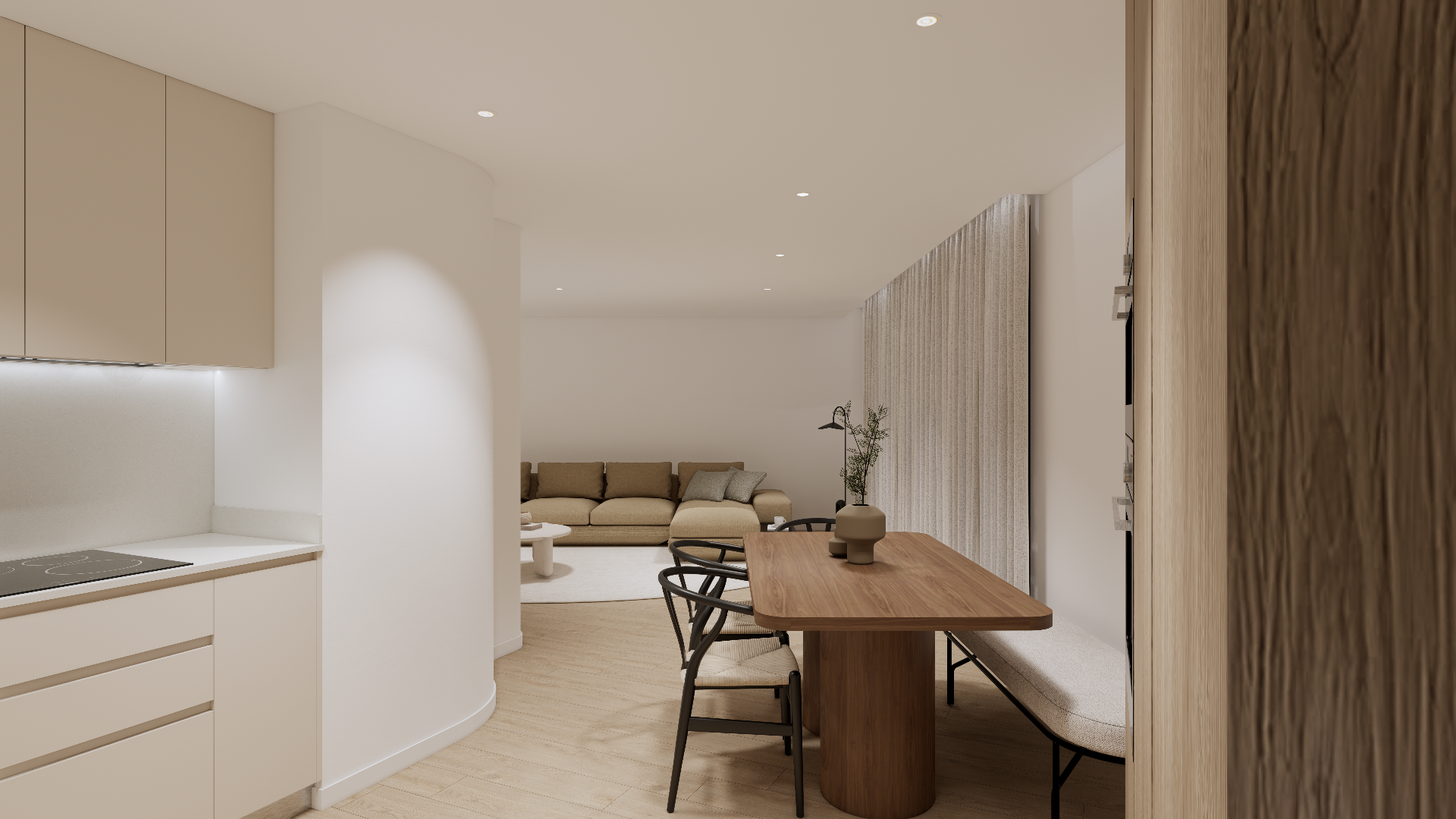 A sala, ampla e convidativa, prolonga-se para a varanda, criando um ambiente perfeito para desfrutar da luz natural e da envolvente urbana. Os dois quartos foram projetados para proporcionar descanso e funcionalidade.