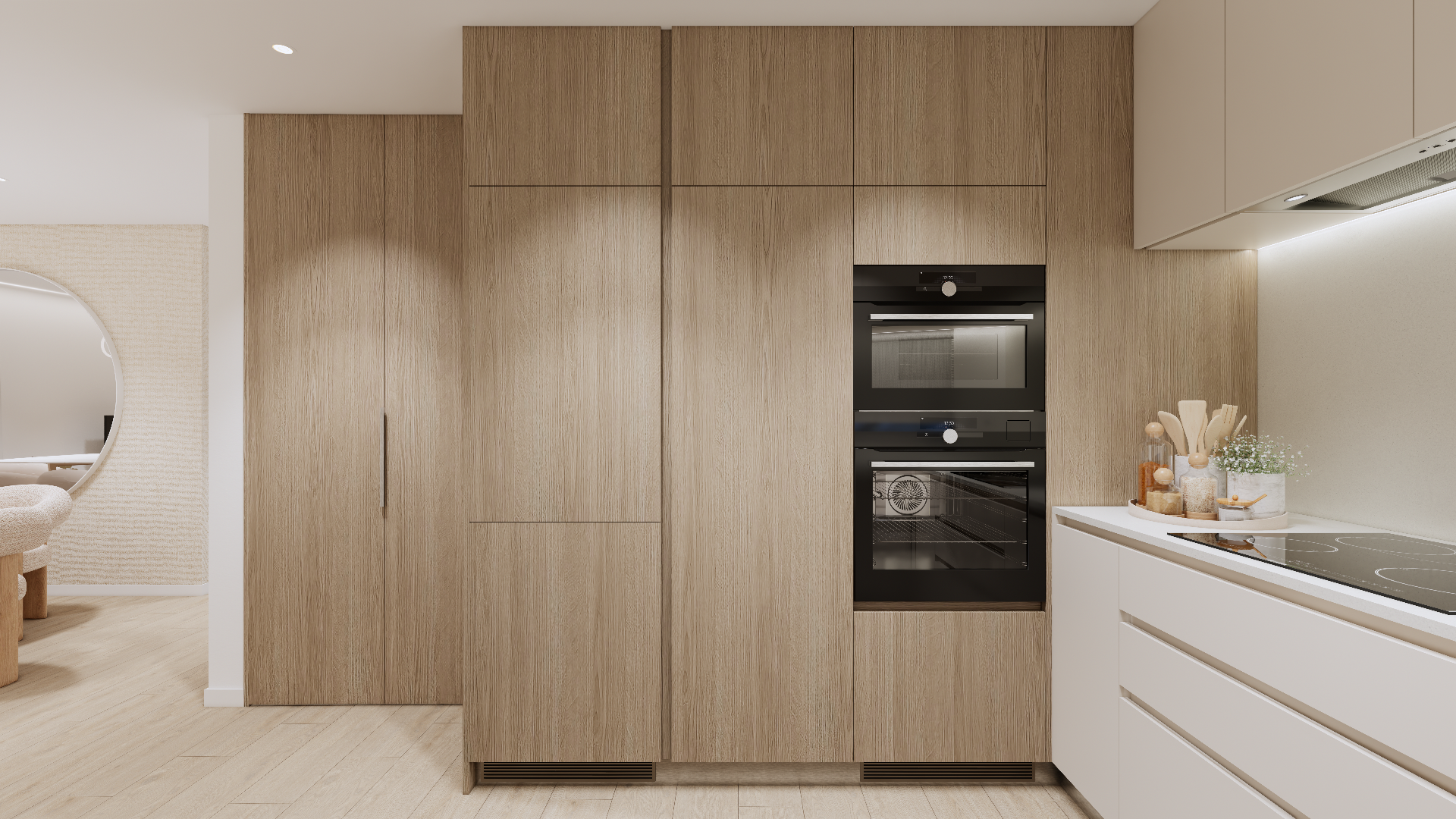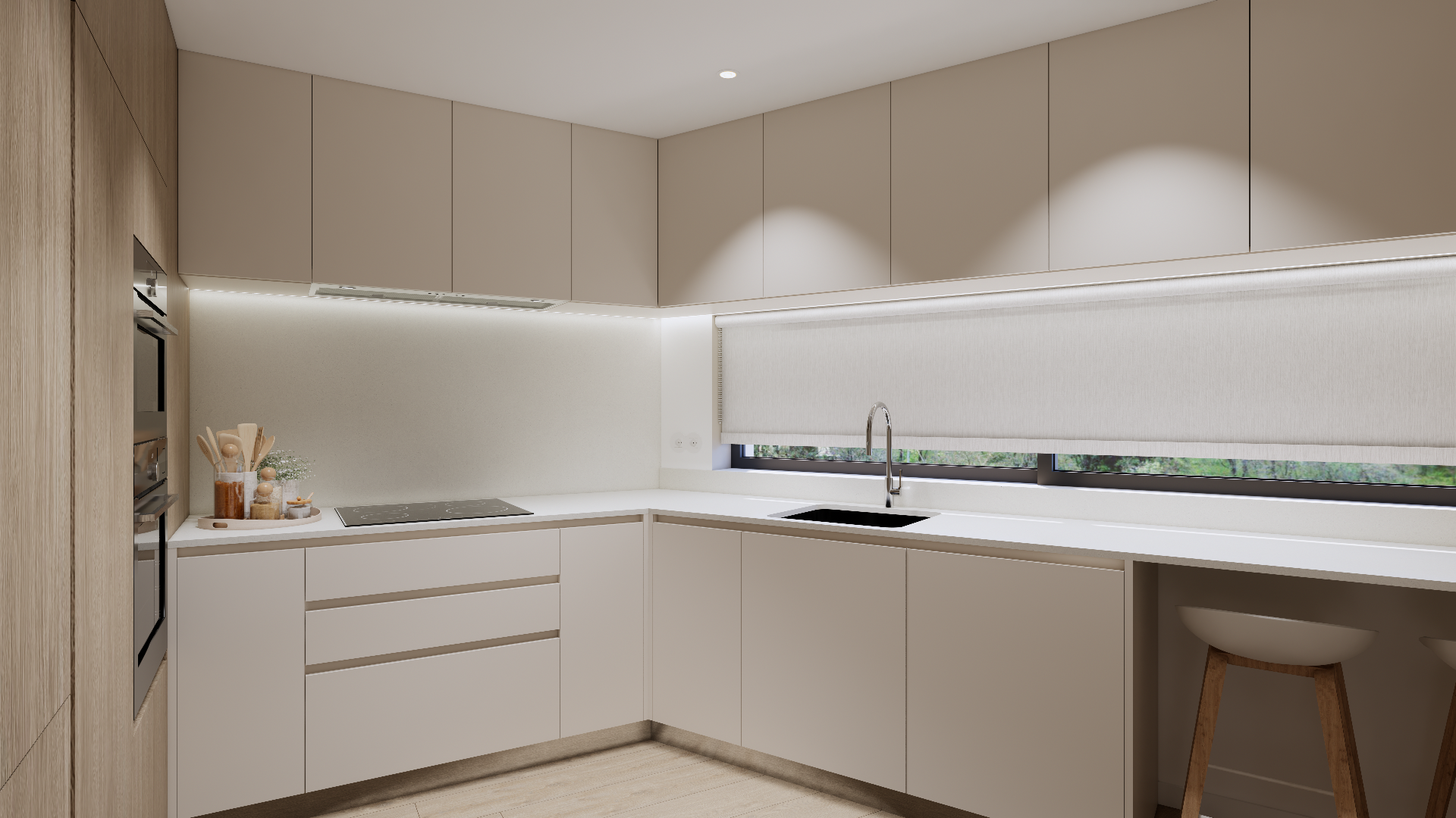 A zona social destaca-se pela ligação à varanda, proporcionando uma sensação de amplitude e continuidade com o exterior. Os dois quartos oferecem um refúgio tranquilo.